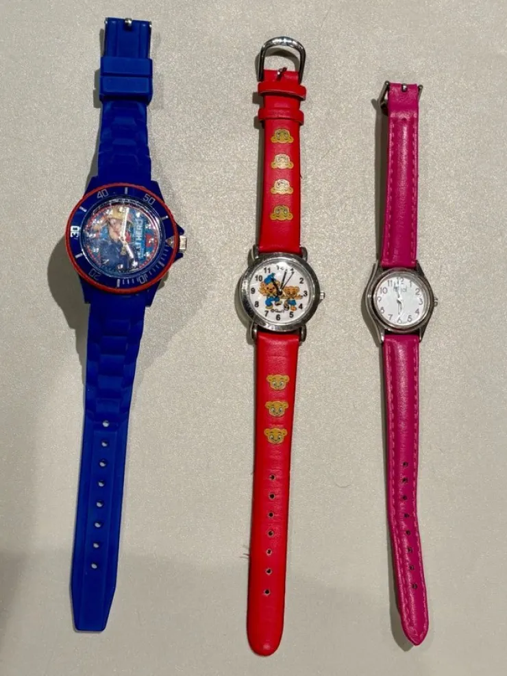 Sælger tre fine børneure i god brugt stand. Et ur har et Bamse-motiv, et med et Regal-motiv og et med Brandmand Sam (Fireman Sam). Urene er analoge og drives med kvartsværk. Remmene er lavet af kunstlæder eller silikone. Perfekte til børn, der vil lære at fortælle tiden!