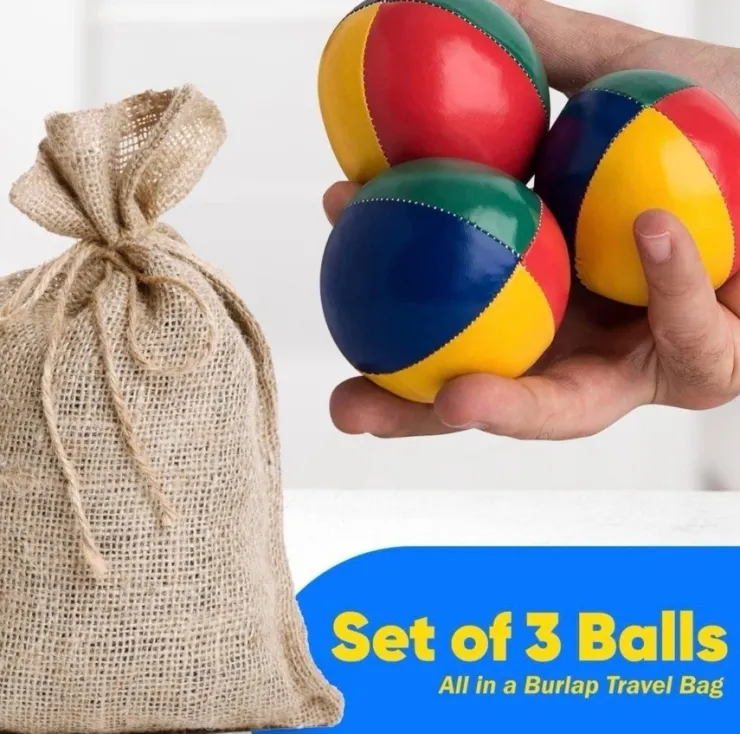 I jutepåsen – 4 färger, beige, röd, grön och blå. Mjuka bollar är 60 mm stora och väger ca 100 gram.