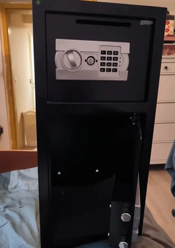Hemmets kassaskåp är tillverkat av robust massivt stål och har en löstagbar låsbult och dolda gångjärn för extra säkerhet.