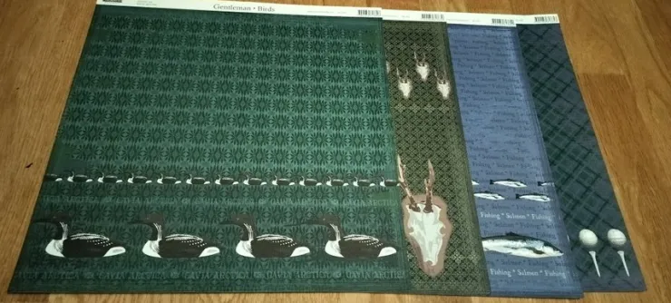 Säljer fyra ark scrapbookingpapper med olika motiv inom ett Gentleman-tema. Motiv inkluderar fåglar, troféer, fisk och golf.