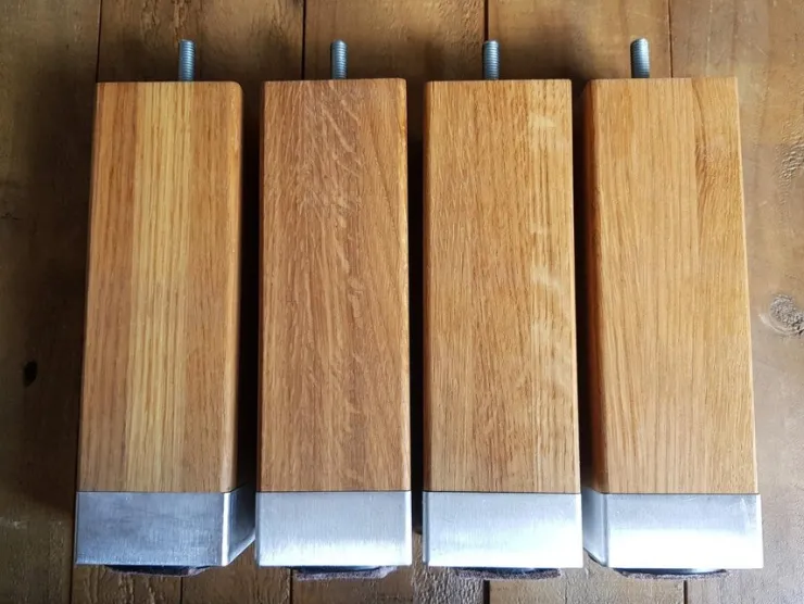 Fyra fina ben i massivt trä med metallkant längst ner.