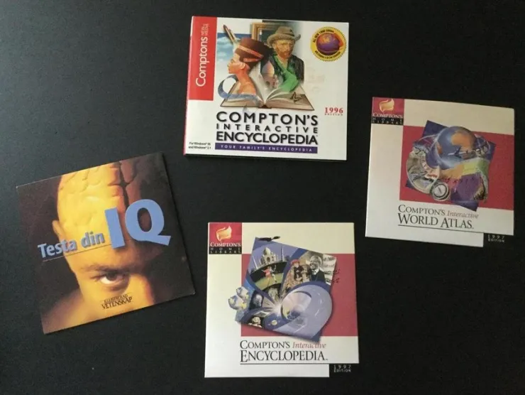 4 CD-rom skivor, "Testa din IQ", World Atlas, Encyclopedia, 1990-tal, ej funktionstestade.