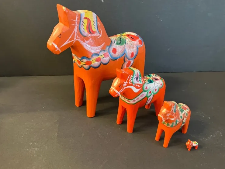 4 st DALAHÄSTAR, DALARNA, SWEDEN, 2 st etikettmärkta, bl a Olsson, retro, bruksskick