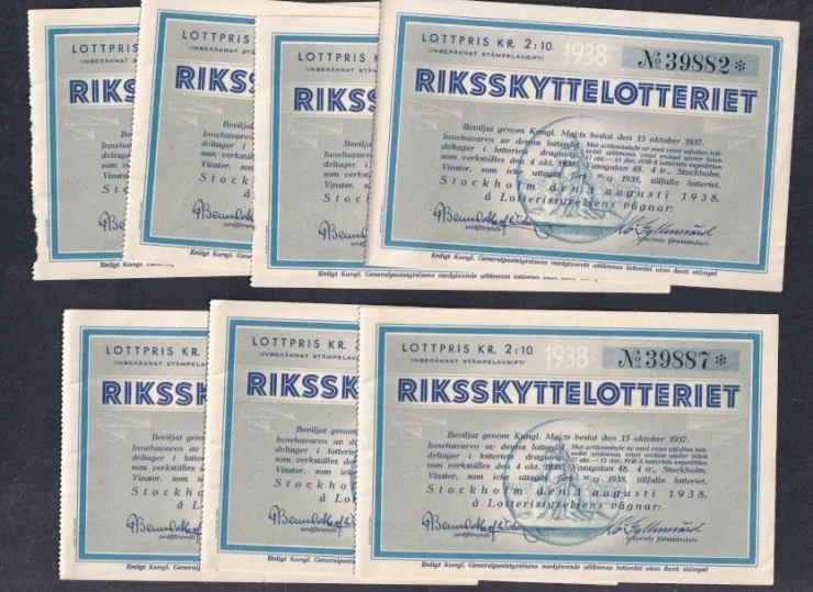 Tradera 7 lottsedlar, Riksskyttelotteriet 1938> Lotterier & Lodsedler