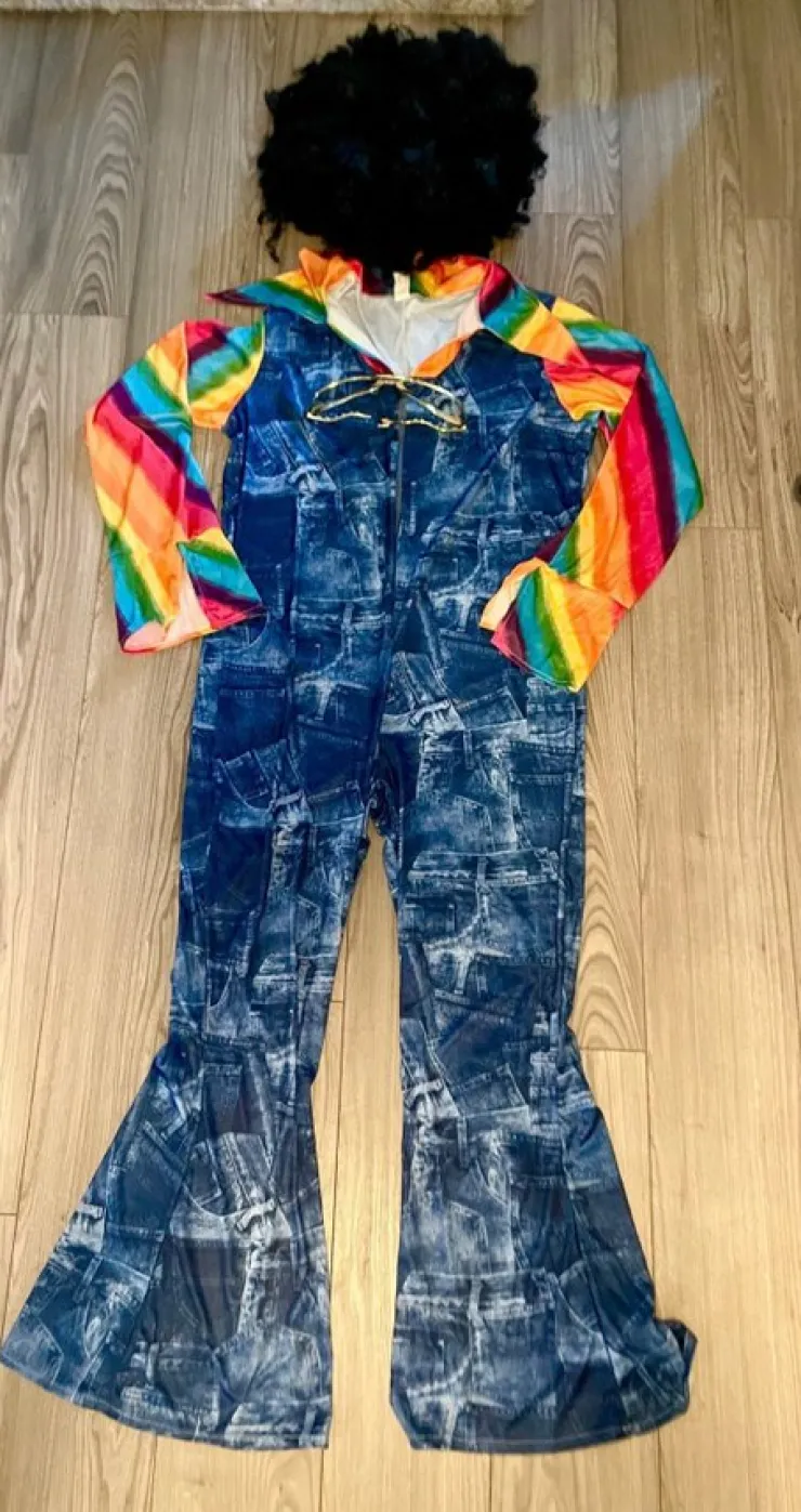 70-tals discokostym i blått jeansmönster med regnbågsfärgade ärmar. Inkluderar en afroperuk. Perfekt för maskerad, temafest eller karneval.
