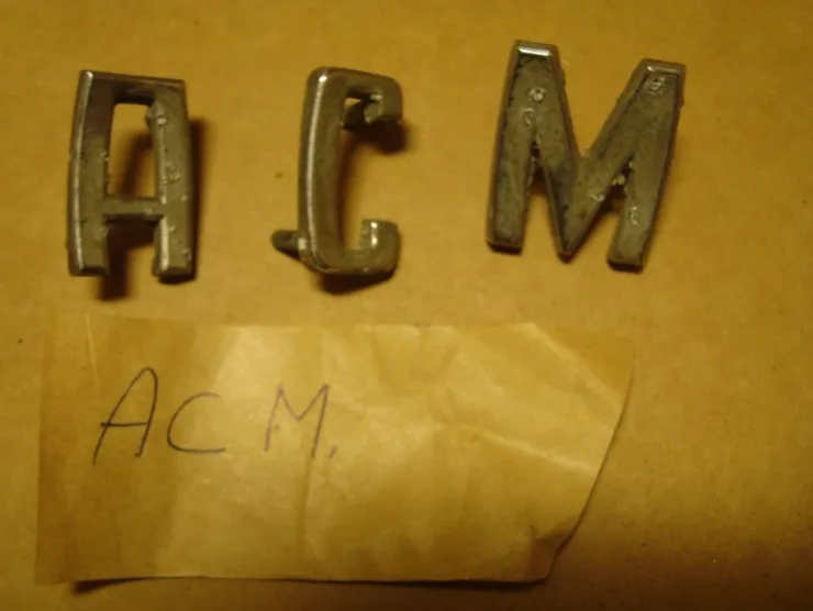 A. C. M. BOGSTAVER PASSER TIL NOGEN BIL. OG MÅSKE TIL MANGE FORSKELLIGE BILER. I GOD BRUGT STAND. SE OVERSKRIFT. STAND SE FOTO. KORT AUKTION.