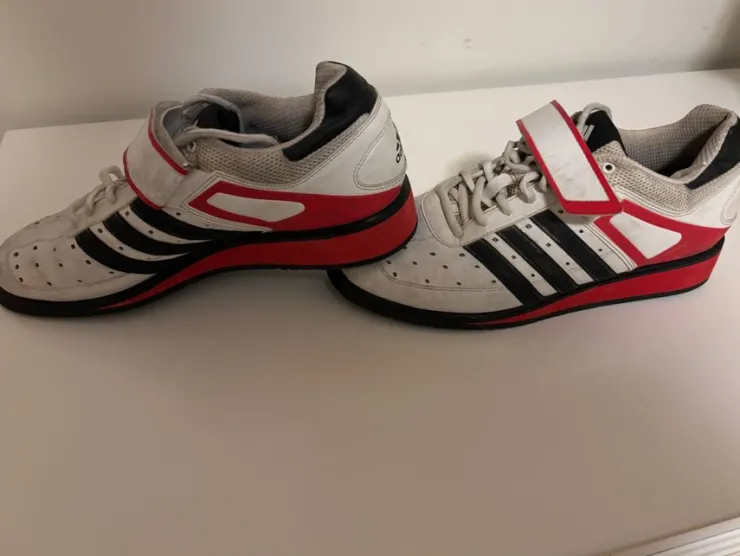 Säljer ett par Adidas lyftskor i vitt och rött. Skorna är i begagnat skick men är fina o fräscha. Perfekta för tyngdlyftning, styrkelyft eller annan styrketräning.