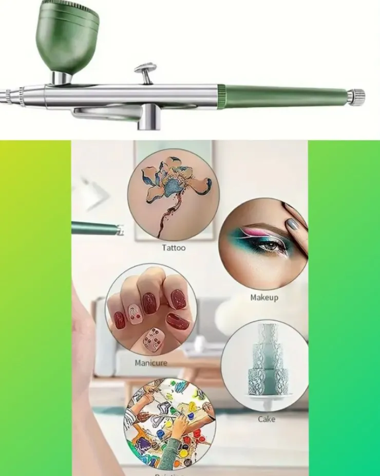 Här är en en grön mångsidig airbrush med med 10 cc metallkopp, 0,3 mm munstycke och Kompressor.