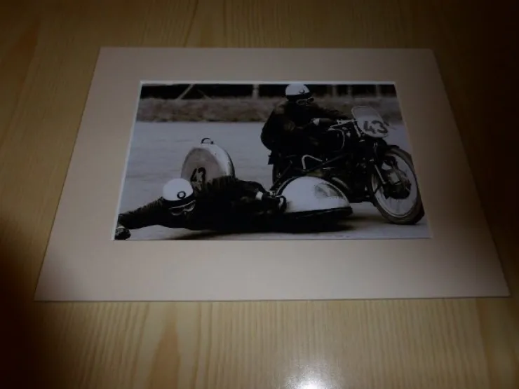 Äldre motorcykel, fotografi är nytryckt. Passepartout storlek cirka 15 cm x 20 cm.