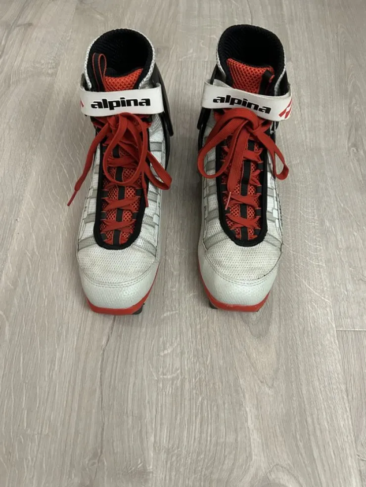 Pjäxorna är vita och röda med snörning.