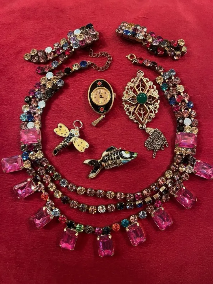 Ute igen pga utebliven betalning. Ännu flera smycken från svärmor: äldre treradigt collier ca 45 cm samt örhängen i strass och glas på mässing utan märkning – brosch i gulmetall med grön ”sten”, märkt Sarah Coventry – litet smyckeur Josmar Swiss made