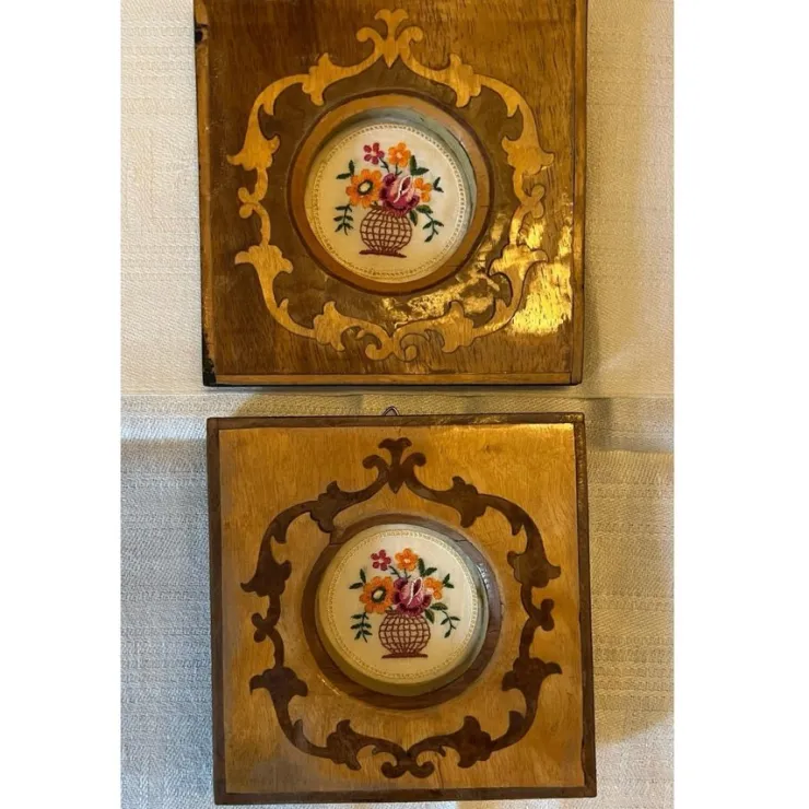 De är handgjorda av trä med mönster av intarsia. Inuti ramarma sitter vackra handbroderade motiv som föreställer blommor i vas. Runtom motivet sitter en ring av papp. På den ena är lös, men det borde vara enkelt att fixa (se sista fotot).