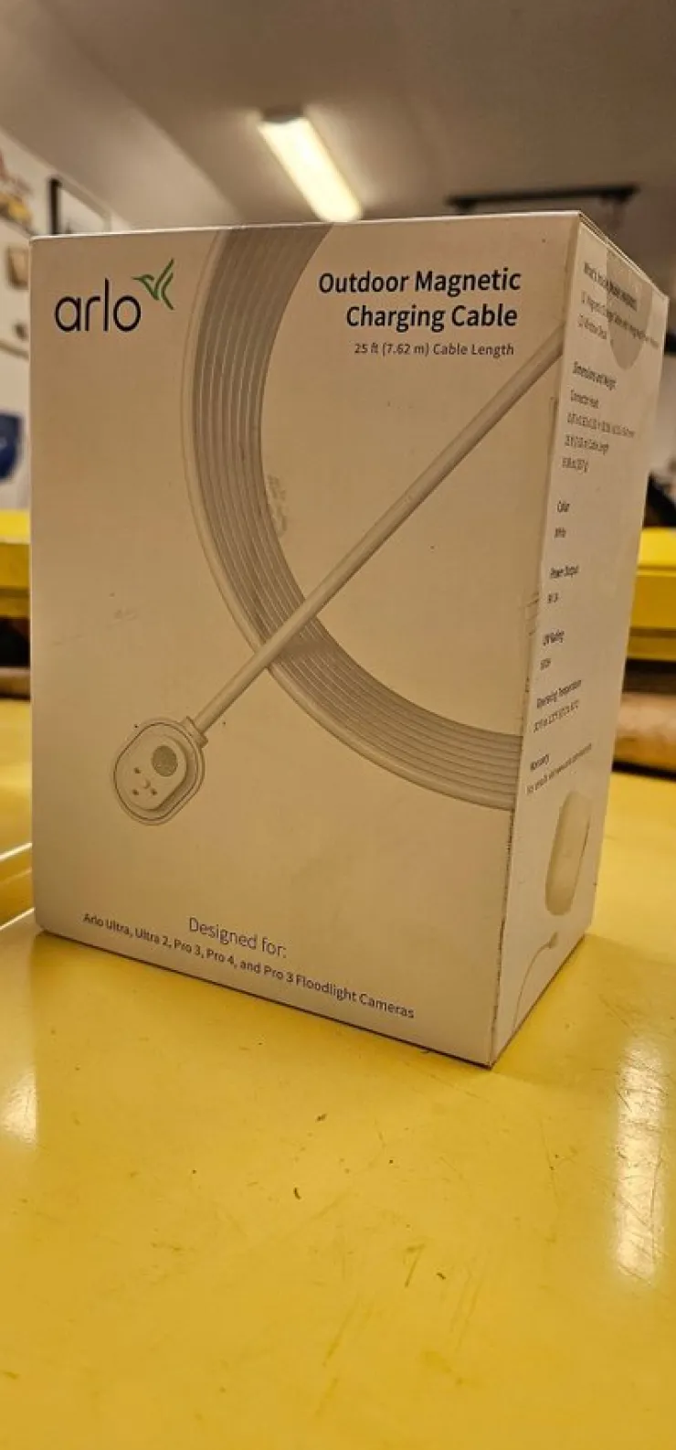 Arlo utomhusbruk magnetisk laddningskabel, 25 fot (7,62 m) lång. Designad för Arlo Ultra, Ultra 2, Pro 3, Pro 4 och Pro 3 Floodlight kameror. Kabeln är vit.