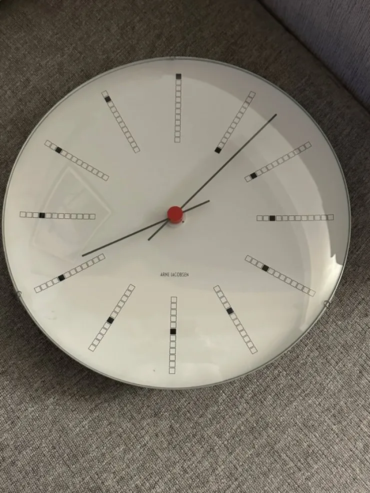 Säljer en vintage Arne Jacobsen Bankers Clock väggklocka. Klockan är designad av Arne Jacobsen för Nationalbanken Danmark 1971. Klockan är i begagnat skick och har några mindre märken. En ikonisk och stilren klocka som passar perfekt i ett modernt hem.