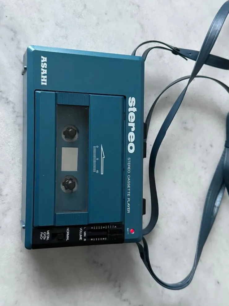 Asahi PD-551 stereokassettbandspelare. Enkel och bärbar kassettspelare, perfekt för retroälskare eller samlare. Drivs med batterier (UM-3/R6/AA x 4) eller extern strömförsörjning (DC 6V). Har funktioner som play, rewind, fast forward, och mute. Inkluderar bärrem.