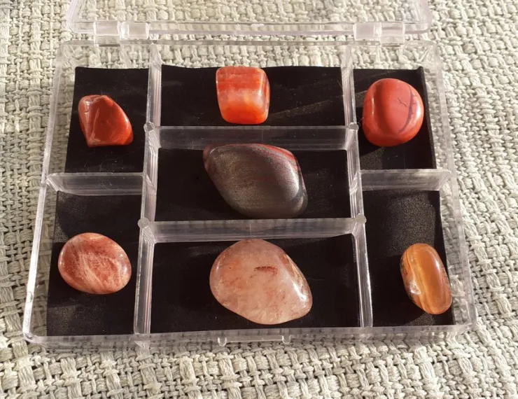 Välkommen att buda på en ask med trumlade stenar i röda färger.