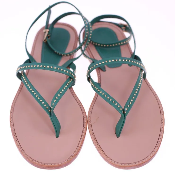 The sandals are made of green leather uppers with a gold-tone metal stud detail and a leather sole