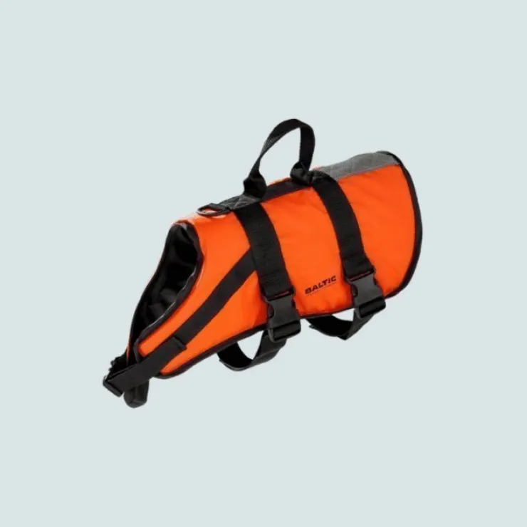 Baltic flytväst i mjukt material, hiz-viz orange färg, reflekterande rand, kraftigt lyfthandtag, breda remmar och en D-ring för att fästa i en ledning. Bekväm flytväst för hundar som både skyddar mot kyla och värme.