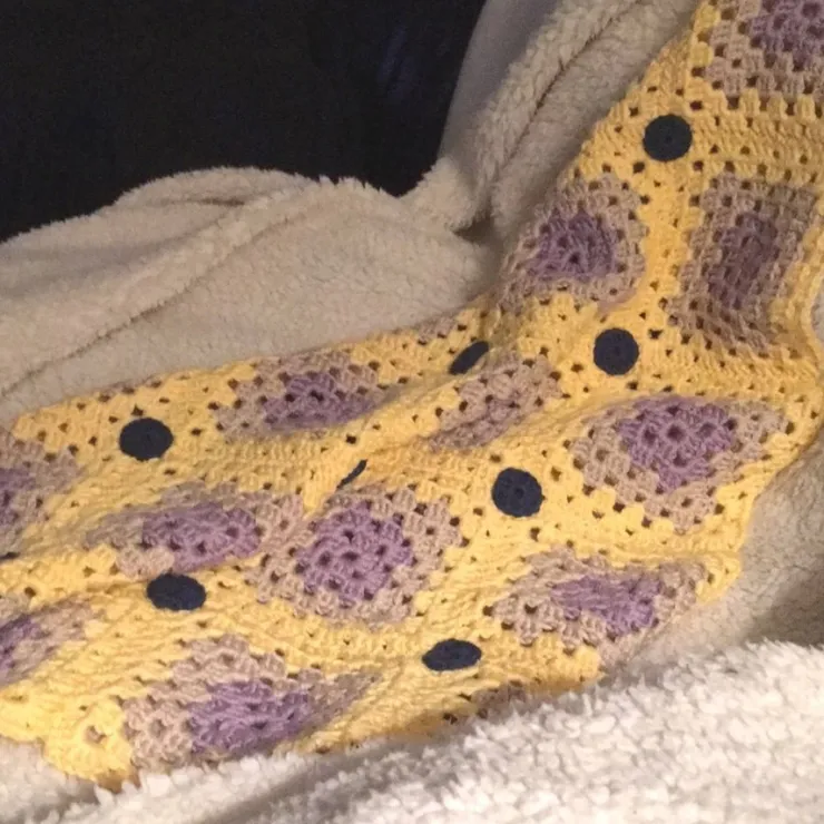Mäter 45 x 56cm färgerna är lila beige och gult