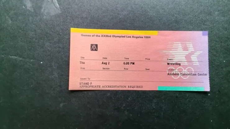 Biljett från Olympiska spelen i Los Angeles 1984, till brottningstävlingen. Biljetten visar datum, tid och plats (Anaheim Convention Center).