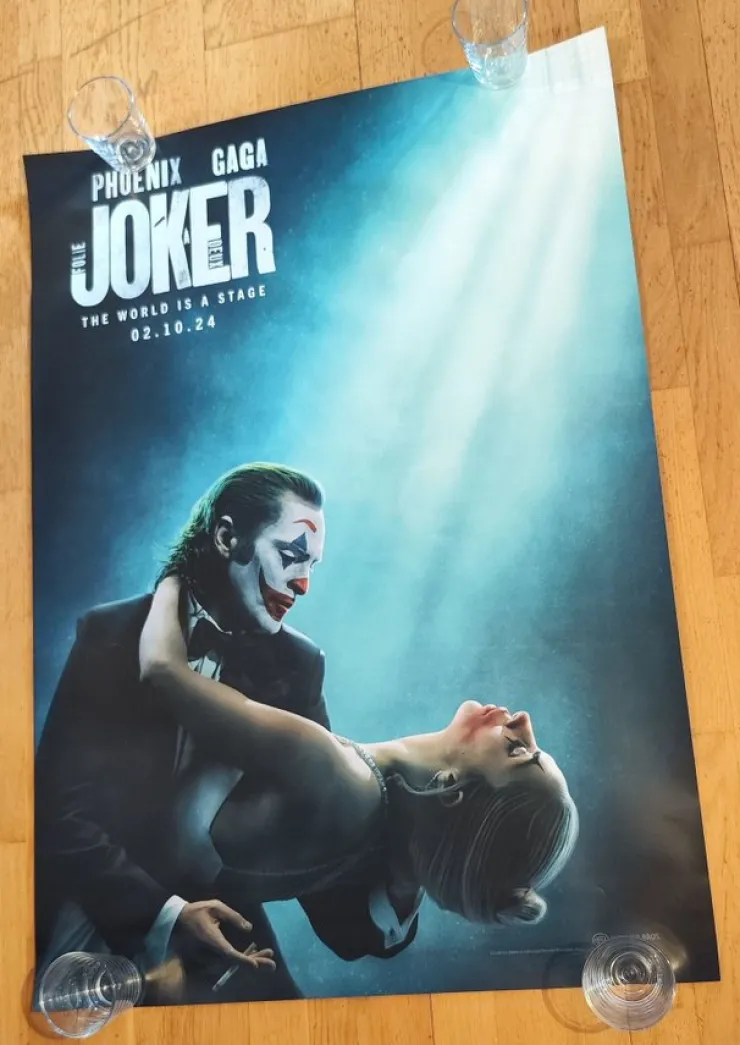 Svensk bioaffisch. Skick enligt bilder. Film med Joaquin Phoenix och Lady Gaga. Har varit ihoprullad.