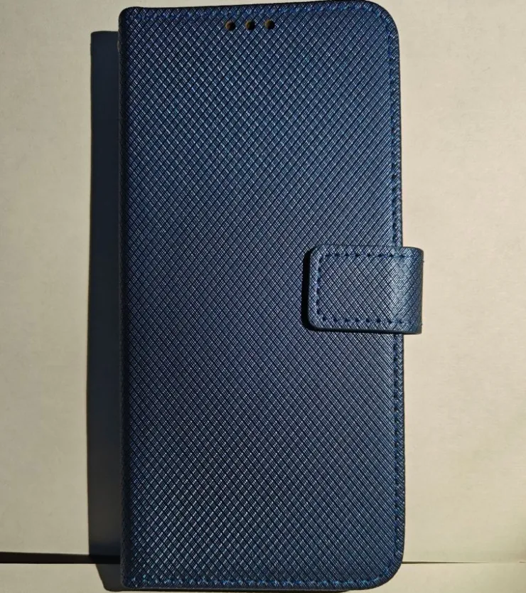 Snyggt och praktiskt fodral för mobiltelefon i blått. Fodralet har ett strukturerat ytskikt och en praktisk magnetstängning. Ett extra band för att fästa mobilen säkert. Helt nytt!