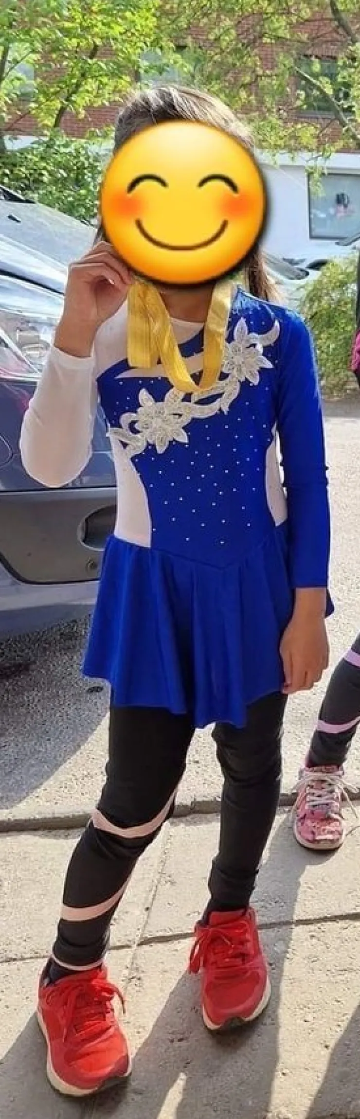En blå och vit gymnastik konståkning dräkt med långa ärmar och en vit mesh-insats på överkroppen. Dräkten är dekorerad med vita blommor och strass.
