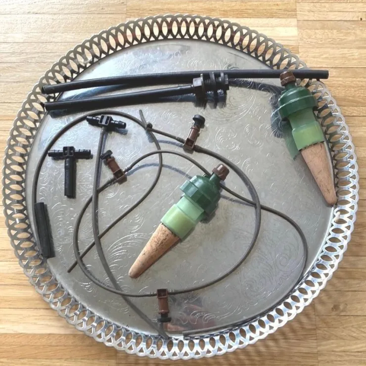Bevattningssystem för krukväxter. Systemet består av slangar, droppspetsar och kopplingar. Perfekt för att hålla dina växter välvattnade.