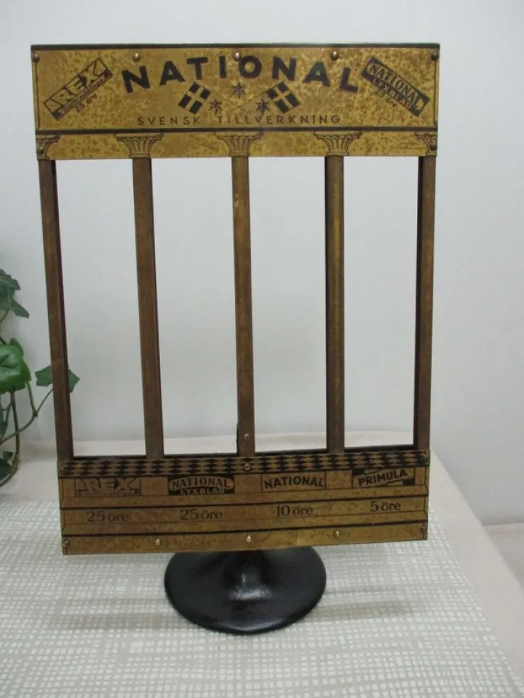 Ställ från lanthandel, med plats för rakblad, rex, national lyx, national och primula från national. Tidigt 1900-tal