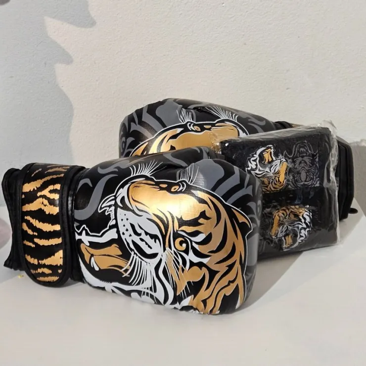 Säljer ett par boxningshandskar från Ragecamel med tigerdesign. Handskarna är svarta med gulddetaljer och har en snygg tigerdesign. De är i bra skick och har aldrig använts.