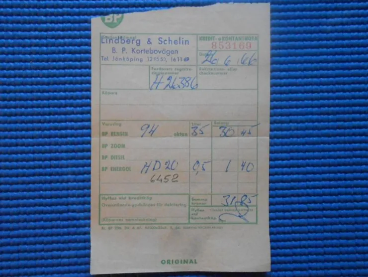 Tradera BP Kvitto bensin. Lindberg & Schelin Kortebovägen Jönköping 1966| Bensinia