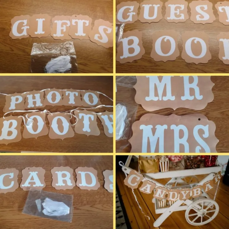 Säljer ett set med bröllopsdekorationer i beige/brun papper med vita bokstäver. Setet inkluderar banderoller med texten "Gifts", "Guest Book", "Photo Booth", "Cards" och "Candy Bar", samt två skyltar med texten "Mr" och "Mrs". Alla delar kommer med tillhörande band för upphängning.