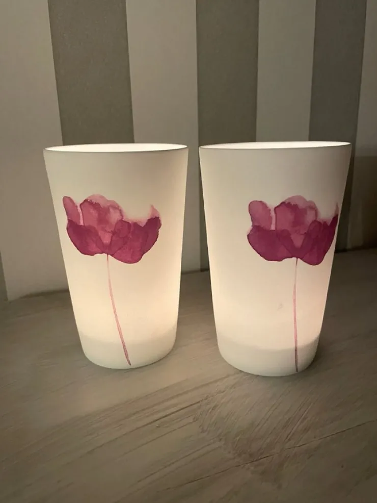 Två stycken ljuslyktor från Broste Copenhagen. De är vita med ett rosa blommotiv.