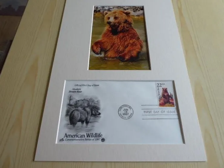 Brunbjörn, fotografi är nytryckta & original USA förstadagsbrev, FDC. Passepartout storlek: A4. + en gratis brunbjörn konst poster, storlek A4.