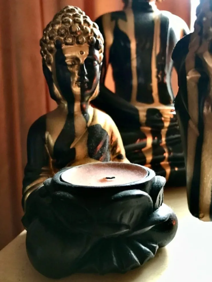 Vacker statyett föreställande Buddha sittande med ett inbyggt ljusfat. Statyetten är dekorerad i svart och guld. Perfekt som dekoration eller gåva.