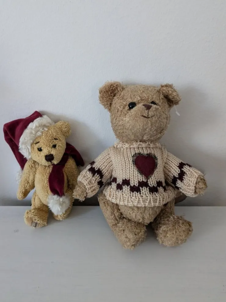 Två söta nallebjörnar från Bukowski Design. Den ena har en röd mössa och halsduk och den andra har en stickad tröja med ett hjärta. Perfekt för att dekorera hemmet eller som en gåva.