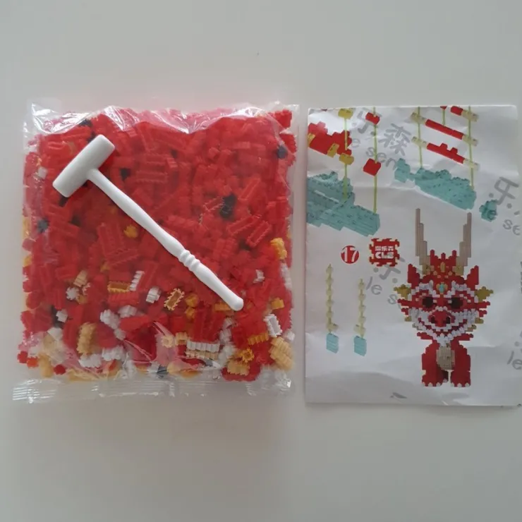Byggset med drake. Innehåller alla delar och en hammare för att sätta ihop delarna. Instruktioner medföljer.