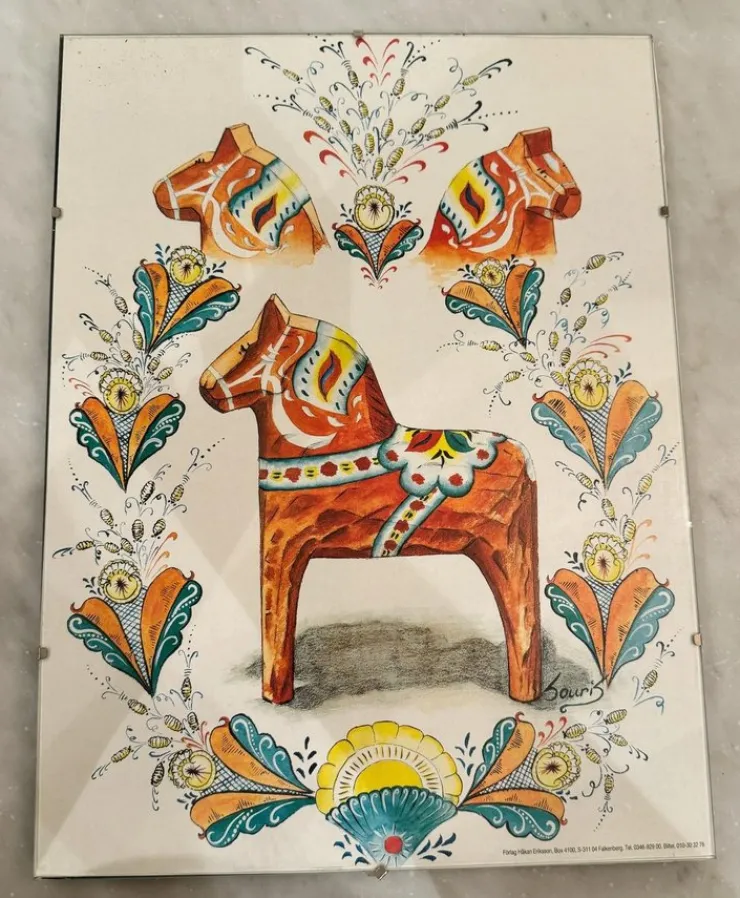 Fint tryck med dalahästar inramad i glasram. Fint skick.