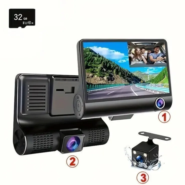 Dash-cam med tre kameror och display som fästs med sugkopp på vindrutan. Kameran framåt är vidvinkel, mörkerinspelande och har en upplösning på 1080p, kupékameran har 480p och backkameran har 720p upplösning med nattbelysning. Inspelning sker i loop så att