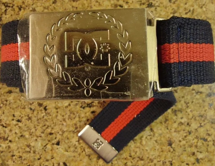 Mörk blått/rött bälte med silver färgat metallspänne och DC-logo.