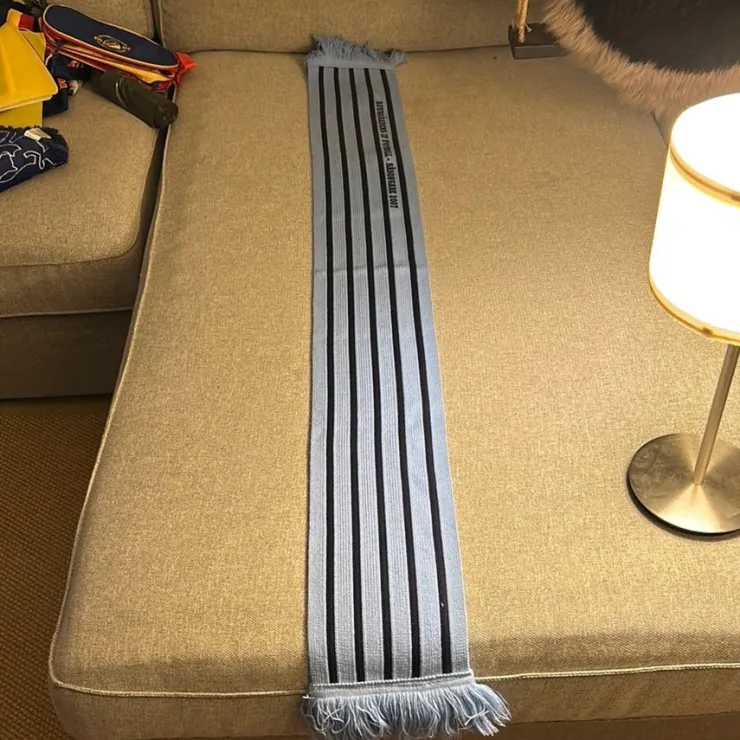 Säsongarehalsduk från Djurgårdens IF Fotboll, säsongen 2007. En blå halsduk med svarta ränder och Djurgårdens IF Fotboll – Säsongare 2007 tryckt på.