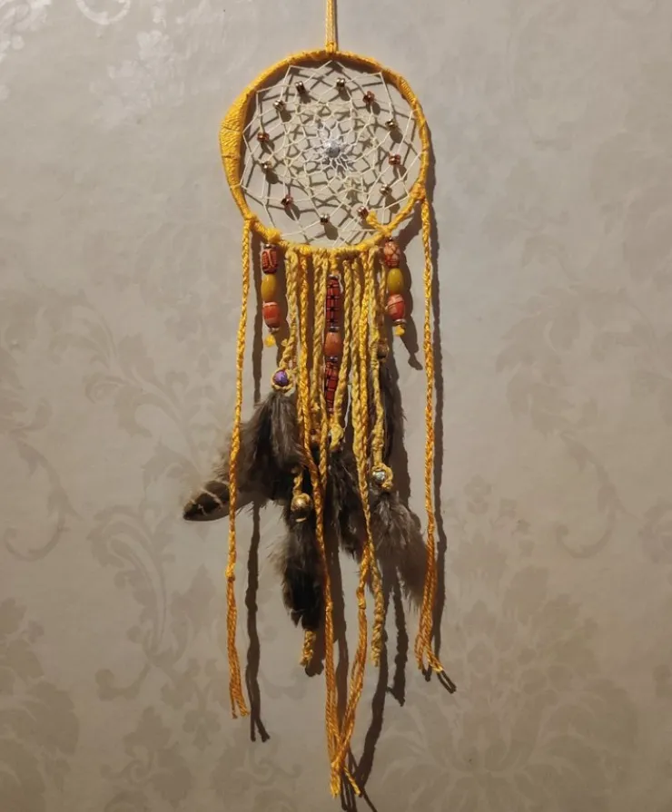 Säljer en drömfångare ca 37 cm, själva hänget är ca 10 cm i färgen gult med troligtvis riktiga fjädrar