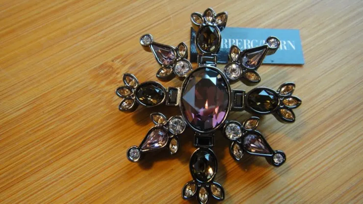 Tradera Dyrberg Kern brosch, svart försilvrad, lilla, vita, gyllene kristaller, oanvänt> Andre Smykker
