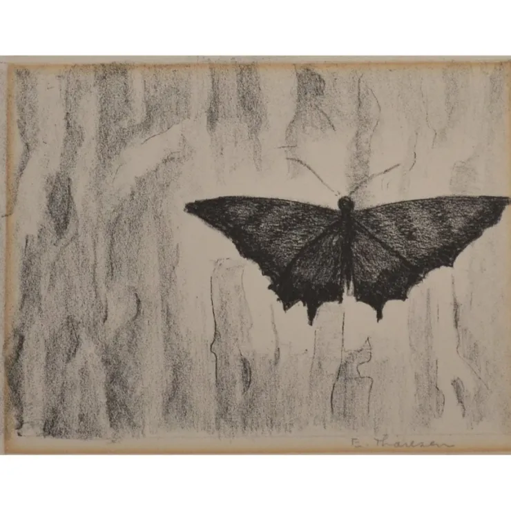 Litografi av Elsa Thoresen, signerad. Motivets mått är 11,5 x 15,5 cm. Oramad (bladet större). Missfärgad efter tidigare pasepartout.