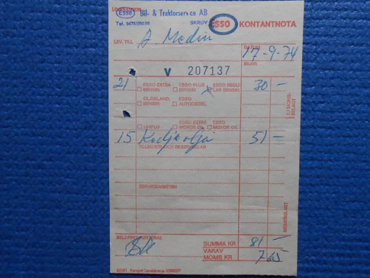 Tradera ESSO Kontantnota 1974. ESSO Bil och traktorservice AB Skruv| Bensinia