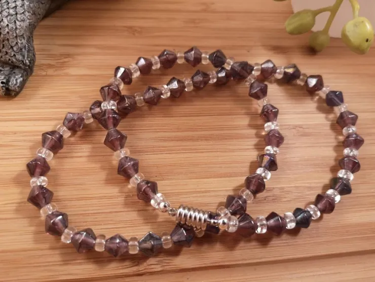 Här erbjuder jag ett intagande halsband i lila och glasklara pärlor. Det består av 8 x 8 mm, ljus lila, skimrande, romb formade glas pärlor samt diskus formade 6 mm i diameter och 3 mm "tjocka", glasklara glas pärlor. Halsbandet mäter hela 58 cm och försett med ett silverfärgad, cylinder formad, magnet lås.