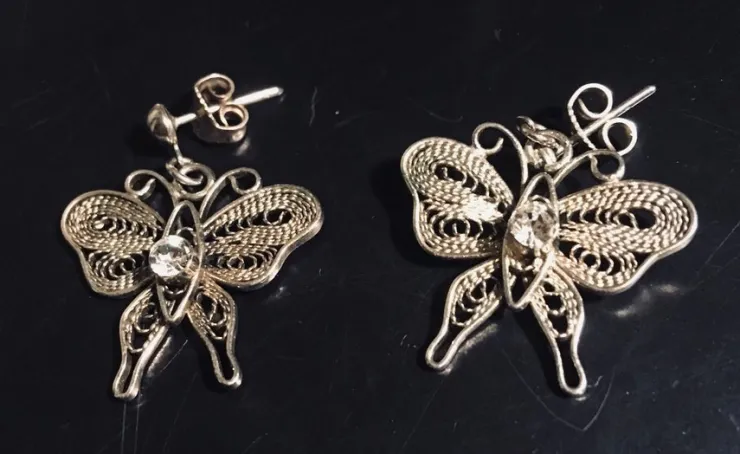 Par örhängen – fjärilar – filigran med glittrig sten i mitten