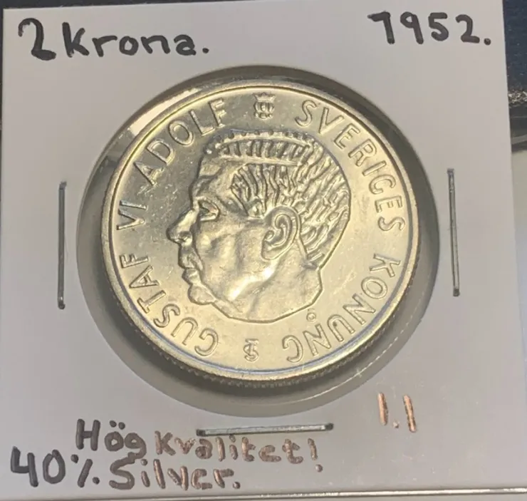 En svensk 2-kroners sølvmynt fra 1952. Mynten er i meget høj kvalitet!