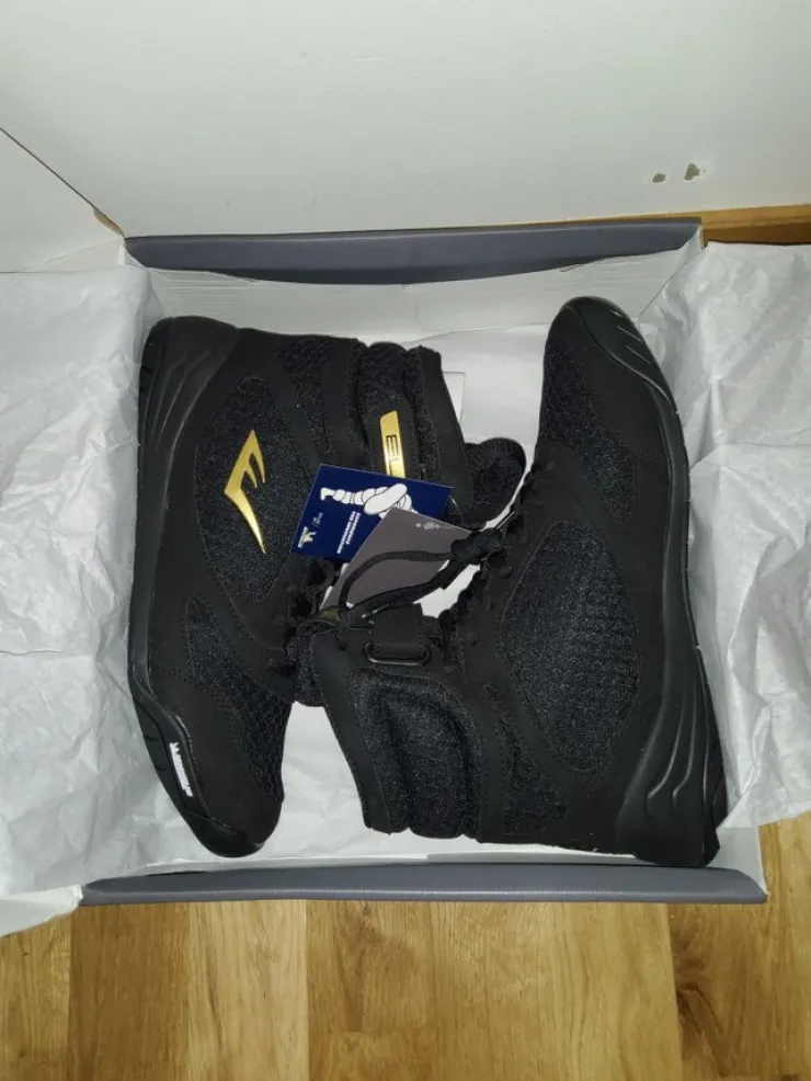Everlast Elite High Top Boxningsskor i svart. Skorna är designade för boxning och erbjuder bra stöd och komfort. Perfekta för träningspass eller tävlingar. De har en hög design och en robust sula.