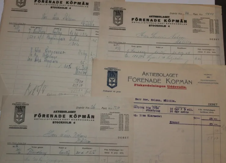 Från Aktiebolaget Förenade Köpmän, en från Fiskavdelningen i Uddevalla och tre från Stockholm och utställda till en lanthandlare i Småland 1920.